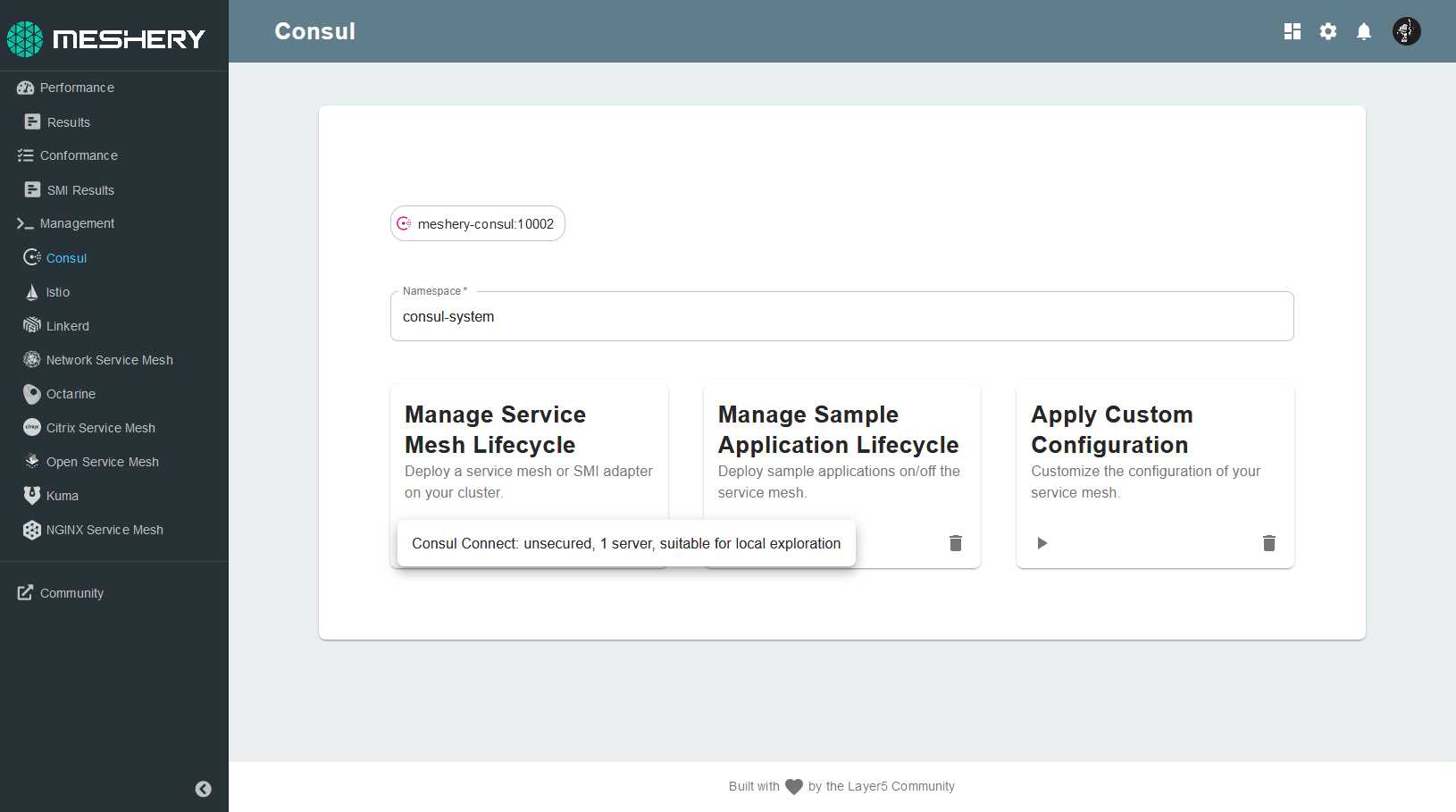 Meshery supports the deployment of a variety of sample applications on Meshery Adapter for Consul. Use Meshery to deploy any of these sample applications.