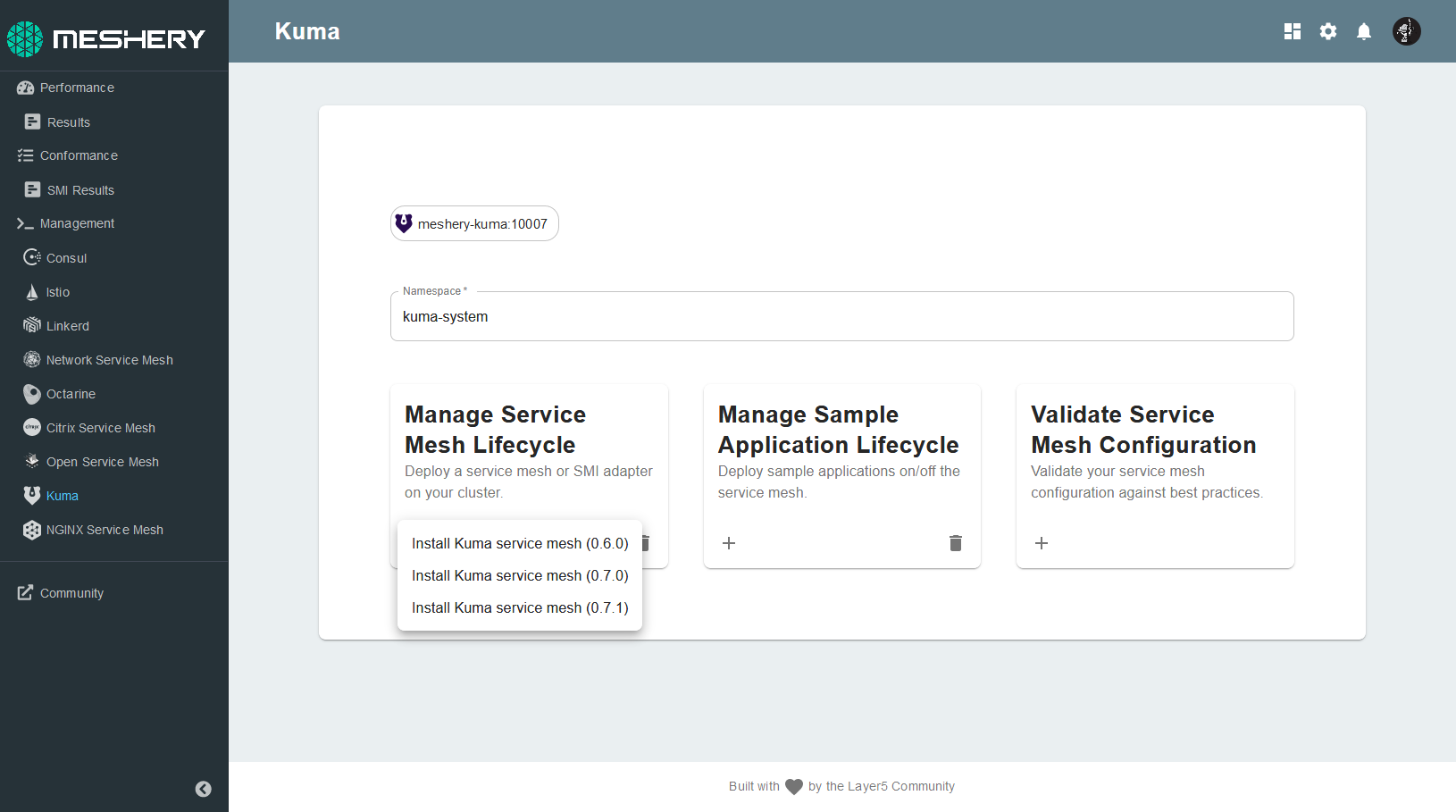 In Meshery's UI, choose the Meshery Adapter for Kuma.