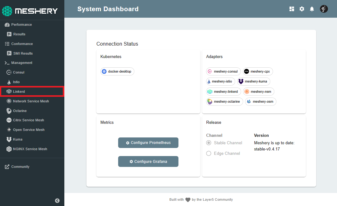 The Meshery Adapter for Linkerd will connect to Linkerd’s Prometheus and Grafana instances running in the control plane.