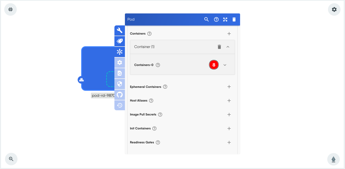 - Scroll down within the Pod configuration modal to the Containers section. Click + to add a container.